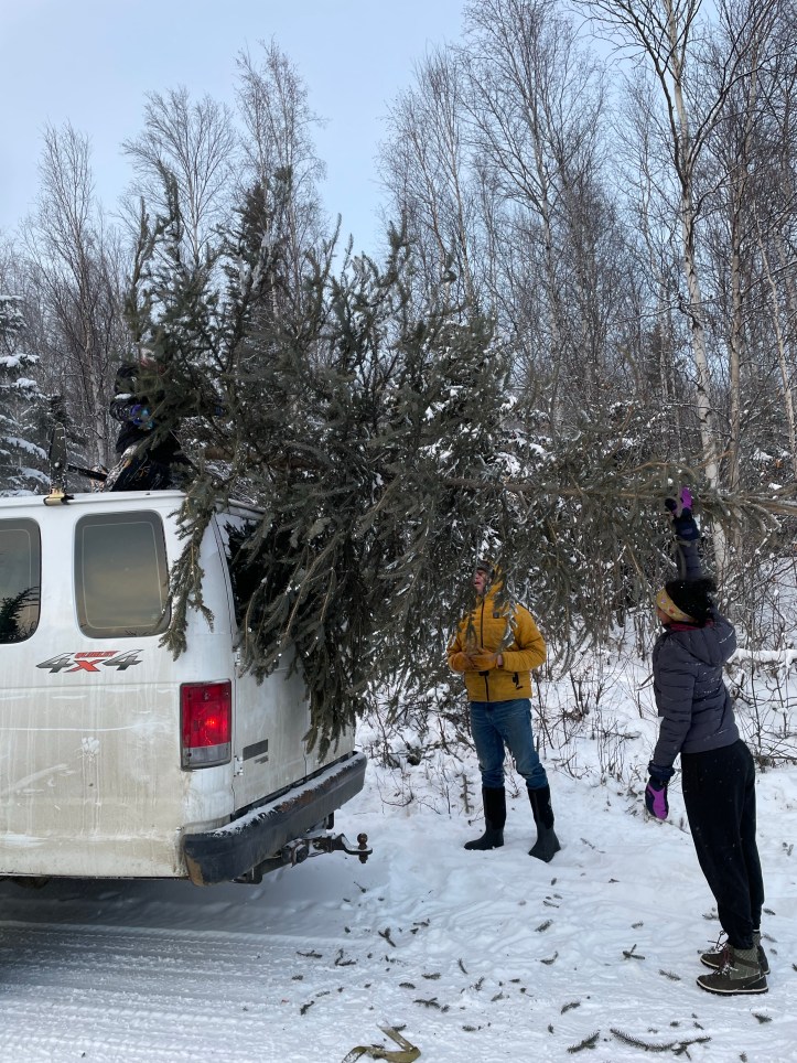 We found the perfect white spruce in the National Forest in that state past the edge of the Frontier. The girls cut the tree down with a saw one of them had carved. The older kids hopped on top of the van to wrestle the lashings while the little girls tottered in the snow looking for all the world like fuchsia marshmallows.